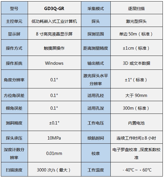 3D溶洞扫描仪(GD3Q-GR型)是目前国内原创。采用相位激光测距的原理进行空间三维激光扫描,配置双探头结构可实现摄像与扫描功能一体化。系统集成度高,内存大,一机多用。既是一部超高清的孔内电视,又是一部高精度的激光扫描仪。